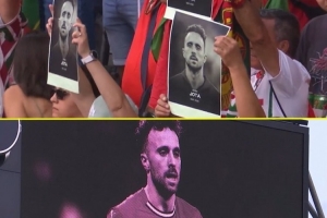 在女足欧洲杯西班牙vs葡萄牙赛前,两队球员及现场观众为若塔兄弟默哀1分钟,场边的球迷们通过各种感人的方式向逝者致意。